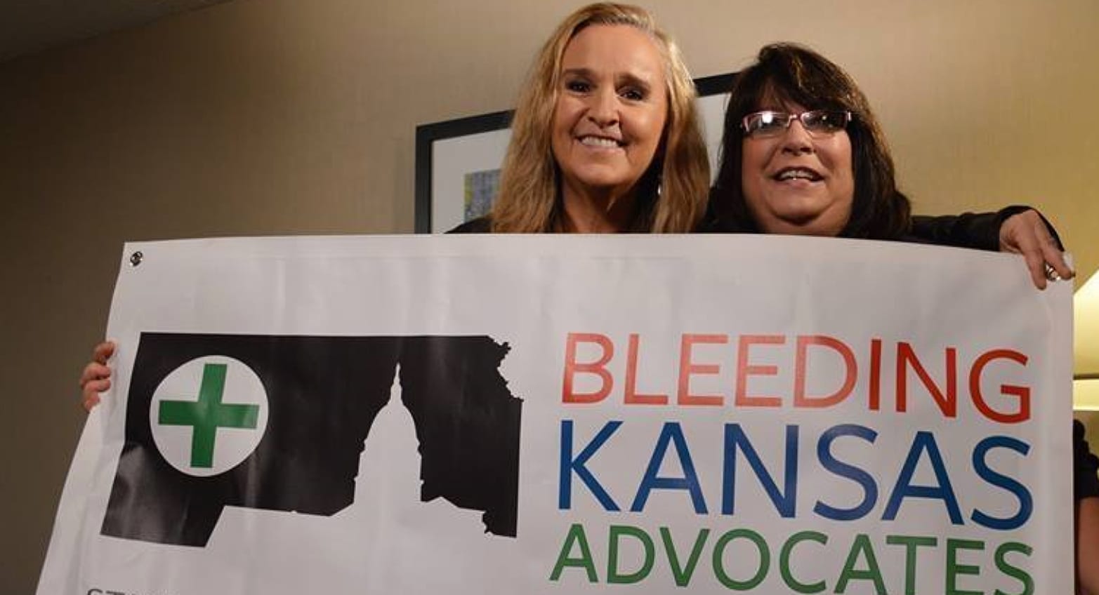 Musician Melissa Etheridge (left) — a Kansas native, breast cancer survivor and supporter of medical cannabis group Bleeding Kansas Advocates — poses with founder and director Lisa Ash Sublett. Photo via BKA