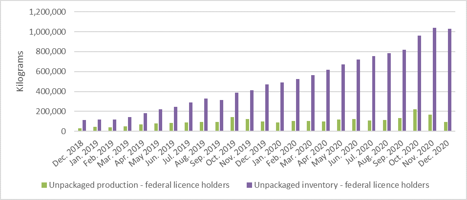 The total volume of unsold dried cannabis inventory held by federal licence holders, provincial distributors and retailers in December was 1,141,000 kilograms, according to new data from Health Canada. Total inventory eased from 1,166,000 kilograms a month prior.