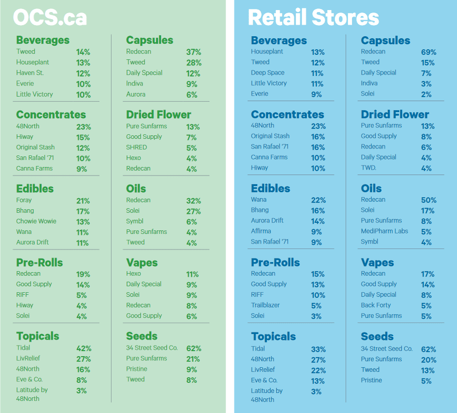 Pure Sunfarms, the producer owned by vegetable grower Village Farms International Inc. (TSX: VFF) (Nasdaq: VFF), led all companies in dried-flower sales at private stores with a 13 per cent share. Meanwhile, private operator Redecan led in both vape and pre-roll categories at 17 per cent and 15 per cent.