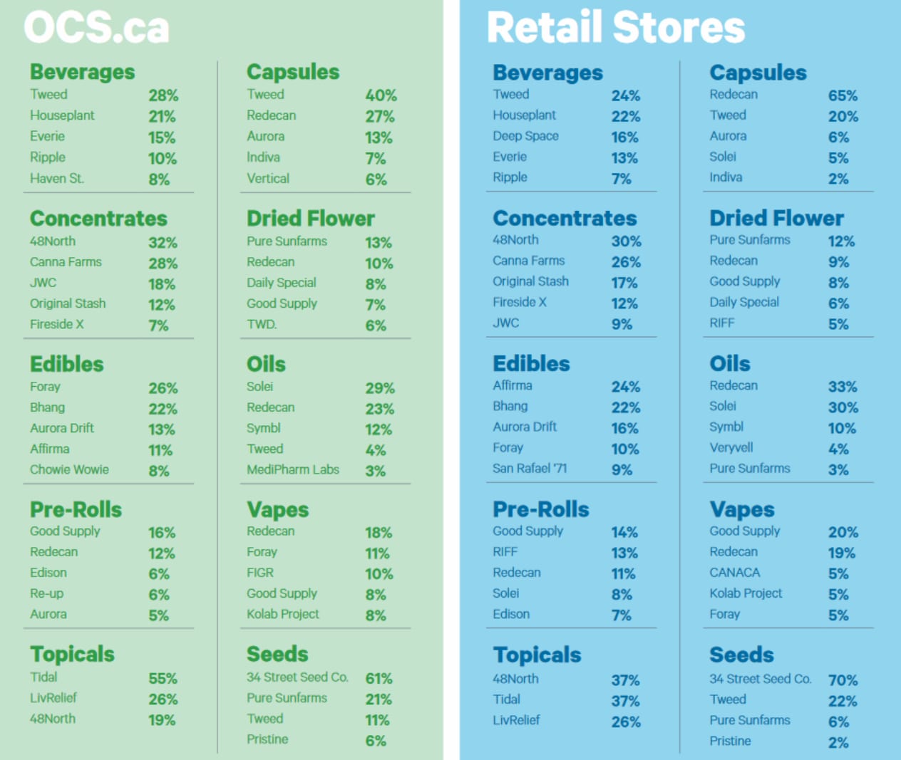 The OCS also highlighted which cannabis brands led in various product categories between July 1 and September 30. Pure Sunfarms, which is owned by B.C.-based vegetable producers Village Farms International, Inc. (Nasdaq: VFF), led the dried flower segment on OCS.ca at 13 per cent and with retailers at 12 per cent. Aphria Inc. (TSX: APHA) and its Good Supply brand took top spots in vapes and pre-rolls at stores at 20 per cent and 14 per cent respectively. Meanwhile, beverages made up only 1.6 per cent of Ontario sales, and Canopy Growth Corp.‘s (TSX: WEED) brands grabbed the top three spots at stores.