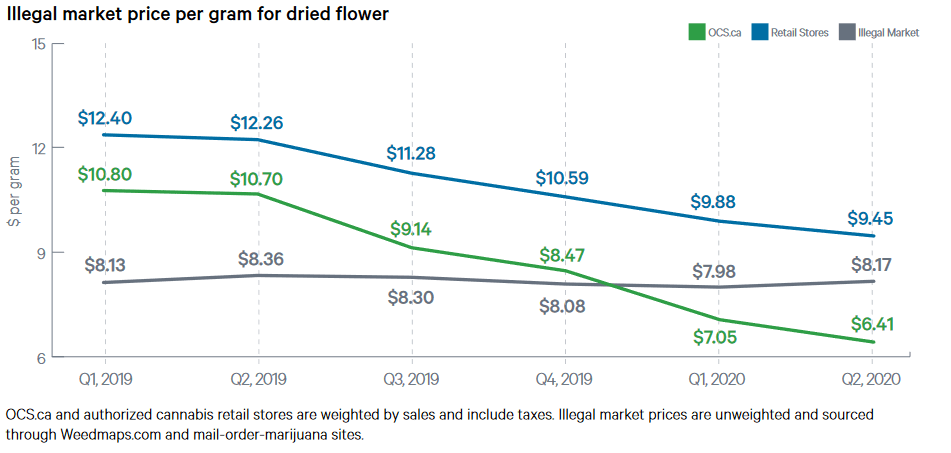 The average price of dried flower on OCS.ca dropped to $6.41 per gram, dropping from $7.05 a gram in the previous quarter.