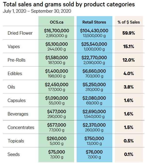 Altogether about 25.8 million grams of products were sold with dried flower accounting for 60 per cent of sales. Vape and pre-rolls came in second and third at 15 per cent and 12 per cent respectively.